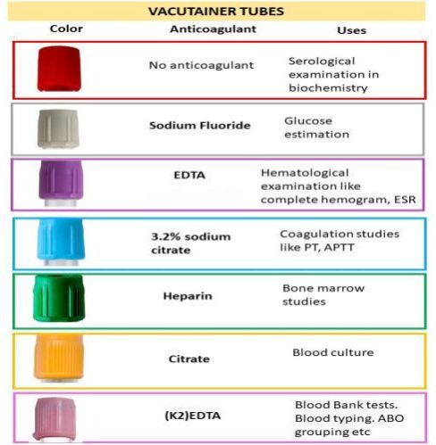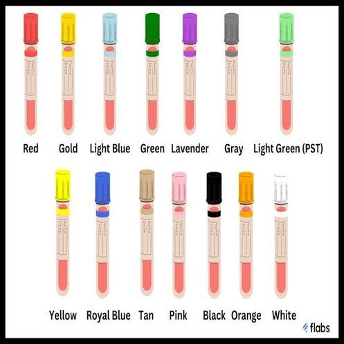 •Lavender (Purple): EDTA — Hematology tests like CBC